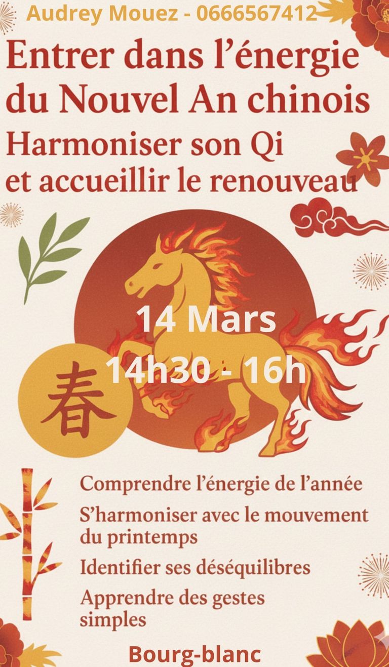 Le 29 mars, je vous propose un atelier dédié à l’énergie du Bois, un élément clé en Médecine Traditionnelle Chinoise. Avec l’arrivée du printemps, il est essentiel de favoriser la circulation du Qi et de retrouver un équilibre intérieur.